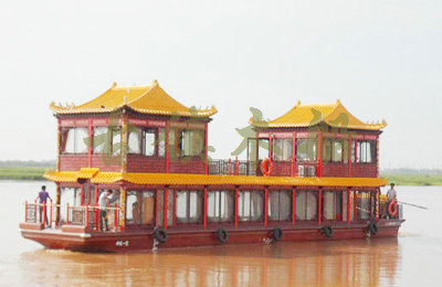 畫舫船就是裝飾古典華麗的游船,是"中國風(fēng)"的仿古游船,結(jié)合古典園林建筑,體現(xiàn)了中華文明的古典藝術(shù).畫舫船豪華而又古典,船上的建筑按照中國古代建筑里的亭臺樓閣,建筑工藝之復(fù)雜,要求之嚴格,仿古畫舫游船的特點飛檐翹角、玲瓏精致的四角亭子逐漸成形,赫然立于船頭,美人靠、盤龍柱子、彩畫……龍柱上的浮雕盤龍和祥云一層扣著一層,層層錯落有致,雕刻精細到盤龍身上的每一個鱗片都細細可數(shù),古代皇家標志性元素,在畫舫船上體現(xiàn)的淋漓盡致。除了雕刻、花窗,整條船還有一個看點,那就是弧線優(yōu)美、高高翹起的船尾。游船并不大,長約10米、寬3米,但是整體看起來堪稱一件藝術(shù)品。船尾的雕花欄桿與船艙、船頭的雕刻遙相呼應(yīng),船身四周貼著浮雕祥云,給整條船增添了富貴、華麗的氣質(zhì)。
